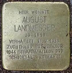 Meanwhile, Landmesser was discharged from prison on 19 January 1941.[7] He worked as a foreman for the haulage company Püst. The company had a branch at the Heinkel-Werke (factory) in Warnemünde.[9] In February 1944 he was drafted into a penal battalion, the 999th Fort Infantry Battalion. After fighting in Croatia on 17 October 1944, he was declared killed in action.[10] Like Eckler, he was declared legally dead in 1949.[10][11]