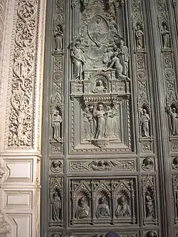 Passaglia also sculpted the monument to the bishop of Lucca, Monsignor Arrigoni, consisting of a bust and a Renaissance-style base. He was commissioned by a lady from America for a sculptural group of Mother and Child. He also completed much work for the facade and other parts of the Duomo of Florence. This included the bronze bas-reliefs for the main entrance of the Cathedral. He also sculpted the marble tympanum that includes of a triangle of 6 meters, representing the seated Madonna surrounded by seraphim; at her feet is the immaculate lamb. Around them are the Gonfaloniere and the Priories of the Florentine Republic (who ordered the construction of the church), Pope Callistus III; Christopher Columbus and his friend the franciscan father Giovanni Perez; Saint Catherine of Siena; and Pope Pius V. He also made two panels in the altar with Queen Ester and the prophetess Debora. The Legend reads: Foederis arra. At the ends of the tympanum, Jacob and Judah. Above the left portal, he sculpted the half-figure of a bound Jesus in the tympanum with two flanking angels below.