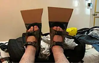 ![]() Self-portraiture on camera in Yettaw's possession at the time of his arrest: shown attached to Yettaw's sandals are homemade swimfins fashioned of heavy paperboard | |
