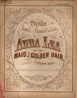 Aura Lea was published by Poulton, an Englishman who had come to the USA with his family as a boy in 1838, and Fosdick in 1861. It was a sentimental ballad at a time when upbeat and cheerful songs were more popular in the music halls.[1] It became popular as a minstrel song, and the tune was also taken up by the U.S. Military Academy as a graduating class song, called "Army Blue"; new lyrics by L. W. Becklaw were sung to the original melody.[1]