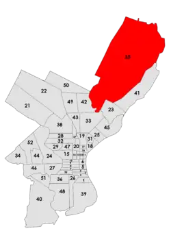 The 1953 elections saw Meade and Meehan enter rival slates in the primaries, with Meade's faction coming out on top.[34] Meehan backed the primary victors in the general election, and the result was a surprise victory in the city controller and register of wills offices that were on the ballot that year.[35] After the election, Meade joined with the Hamilton brothers of Roxborough's 23rd ward to place William Hamilton Jr. at the head of the city committee.[36] However, Meade and Meehan soon both tired of Hamilton, and replaced him with the newly elected register of wills, Robert C. Duffy.[37] By 1954, they were again at odds over the distribution of federal patronage.[14]