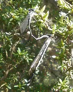 Emergence occurs during the day from the months of October to February, with the majority bursting around January.[13] However adults can be found at late as May in Dunedin and in early June in Northland.[8] After emergence and maiden flight, young adults mature sexually for several days; during this time there can be quite a high number of dispersals.[8] Once males reach maturity they venture out to find habitats suitable for breeding and to set their territories where they stay motionless on their established porch for extended periods of time until they are bothered by an intruder.[8] Early afternoons, the height of reproductive activity, you will see males go chasing after females that fly through their territory. The mating "wheel" lasts for 10 minutes, and egg-laying generally occurs in tandem; the pair land on a floating piece of vegetation and the female drives a shaft through the stem and into the pith.[9][8] She then lays 6–9 eggs, taking up to a minute. This is repeated and eggs are laid out either in close batches or spaced between one another. Once the nymphs, known as pronaiads, are hatched they begin to search for water so they can moult and release the second larval instar (about 2.3 mm long).[8] These nymphs are quite active swimmers; once they reach a later stage they roam about on the surface of detritus and vegetation on the bottom of ponds.[8]