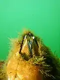Austromegabalanus psittacus is a large sessile barnacle that lives in groups on hard substrates. It has a tall cone-shaped carapace composed of twelve large plates made of calcite microcrystals which are cemented together. The basal disc is firmly cemented to a hard surface. It grows to a height of 30 centimetres (12 in). There is an opening at the top with a hinged operculum through which the thoracic limbs known as "cirri" protrude. The general colour is dull white with purple and brown markings.[5]