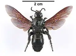 Austroscolia soror is a species of scoliid wasp and a common insect found in eastern Australia.[1] This is one of several Australian species collectively referred to as a blue flower wasp, black flower wasp, or blue hairy flower wasp.