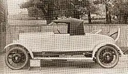 The first cars in 1913 were cyclecars powered at first by Peugeot and later by JAP air cooled V-twin engines. The Peugeot engine was mounted with its cylinders in a "fore and aft" layout and drove the rear axle via a chain but the JAP version had the engine mounted across the chassis with a chain drive to a separate gearbox and shaft to the back axle. In spite of being air cooled both cars had a dummy radiator.[1]