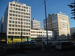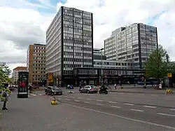 The northern half of the Autotalo block. On the left is the Kampintorni building, on the right is the former head office of the Pohja insurance company.