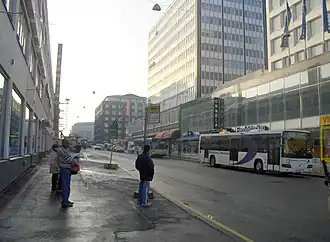 A view of Fredrikinkatu at Autotalo. On the right are the Kampintorni and Autotalo buildings, on the left is the Tennispalatsi movie theatre and cultural centre.