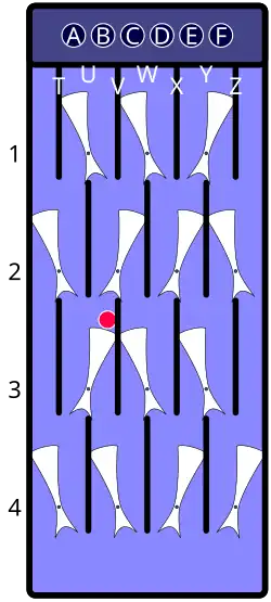 | Descrip. | Arbitrary starting position; all gates have been set to the left or the right. Assume a marble is dropped through the hole labeled "B", next to the leftmost hole. | As the marble travels down the "B" lane, moving past the upper part of the gate with its pivot at U1, it strikes the bottom part of the gate, causing U1 to flip to the right. | As the marble continues to travel down the "B" lane, it next strikes the bottom part of the V2 gate, causing V2 to flip to the left. | Since the U3 gate is already flipped to the right, its state does not change and U3 stops the marble, which comes to rest on the upper part of that gate. | Dropping another marble down the "A" lane switches the positions of U1, T2, U3, and T4; this second marble ends up at the bottom; because the second marble causes U3 to flip to the left, U3 releases the first marble, which travels down the "B" lane, flipping U3 back to the right. The first marble is then caught by V4. | ||||||