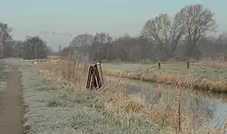 The Somerset Levels have been occupied since the Neolithic period, around 6,000 years ago, when people exploited the reed swamps for their natural resources and started to construct wooden trackways such as the Sweet and Post Tracks,[8] and they were the site of salt extraction during the Romano-British period.[9] Much of the landscape was owned by the church in the Middle Ages when substantial areas were drained and the rivers diverted, but the raised bogs remained largely intact. Only the Inclosure Acts of the 18th century, mostly between 1774 and 1797, led to significant draining of the peat bogs, although the River Brue still regularly flooded the reclaimed land in winter.[3][10] Following the Somerset Drainage Act 1801 (41 Geo. 3. (U.K.) c. lxxii), parts of the Brue were straightened, and new feeder channels constructed.[11]