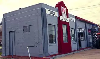 While the station competed for business with the Jackson Conoco Service Station at the same intersection, it still faced less competition than most Route 66 stations, four of which were often situated on the same corner. In fact, the two stations had no history of contentious competition despite their proximity, a sign that both received sufficient business from travelers on the highway.[4] The station survived a contraction in the gas station business during World War II, though it changed ownership during the period; it continued to operate well into the postwar period, albeit under different owners and affiliations. By 1948, the station became a Phillips 66 affiliate and was owned by William J. Schulte. The station became a Texaco affiliate in the 1960s and passed through a succession of owners during the decade. As Interstate 40 bypassed Route 66 in the 1960s, traffic to the station declined after the decade. The station has since been converted to a muffler store, which is still in business.[3]