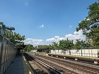 This station underwent reconstruction from September 2009 to December 2011. Both platforms were rebuilt with new windscreens, canopies, and tactile strip edges. A temporary platform over the express tracks was used to provide service on the side that was under rebuilding.[7] The new windscreens were controversial with nearby community members, since the windscreens contained gaps that allowed trash and noise through while causing privacy issues for residents whose backyards faced the station.[8]