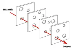 Reason's model, commonly referred to as the Swiss cheese model, was based on Reason's approach that all organizations should work together to ensure a safe and efficient operation.[1] From the pilot's perspective, in order to maintain a safe flight operation, all human and mechanical elements must co-operate effectively in the system. In Reason's model, the holes represent weakness or failure. These holes will not lead to accident directly, because of the existence of defense layers. However, once all the holes line up, an accident will occur.[6]