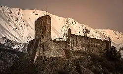 It is said that Cleph, king of the lombards, built the earliest fortification on the Pezzulano peak in 574,[2] but the earliest mention of the current structure is in 924 under the margrave of Turin Arduin Glaber. With its mighty bulk and high towers,[3] it expanded rapidly thanks to its position (it was the last stronghold before Turin for those invading from France), undergoing frequent assaults and much looting over the centuries.