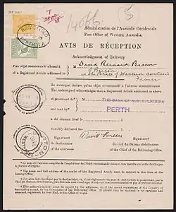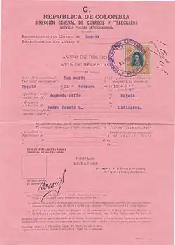 Avis de réception (English: advice or acknowledgment of receipt) is a postal service returning to the sender a form or card signed by the recipient.[1][2] This is evidence that the letter was received, and these forms (or cards) are frequently seen with legal endorsements. It had existed under various names in some postal entities as early as the late 18th century, and was adopted by the GPU General Postal Union in 1875, and again by its successor, the UPU Universal Postal Union in 1879.
