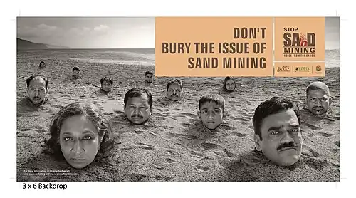Awaaz Foundation inspected numerous illegal sand mining sites in the coastal areas near Mumbai including Thane, Vaitarna, Bankot Creeks, Kihim and Awas beaches and sent their findings to the MoEF, Government of Maharashtra, police and local authorities.[84] They were instrumental in bringing public awareness about illegal sand mining and political links to this activity. Awaaz Foundation published a Report ' The links between politicians and sand mining in and around Mumbai.[85] To control illegal sand mining controlled by politicians, Awaaz Foundation has proposed a specially trained environmental police in India.[86]