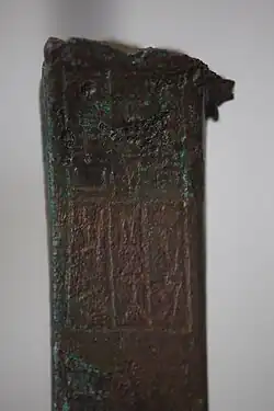 On a monument recording one of his military campaigns, Sargon of Akkad (c. 2334–2279 BC), first ruler of the Akkadian Empire, lists captives and loot acquired including "booty of Awan".[4] An unknown king of Awan (sometimes speculated to be Khita) is recorded as having signed a peace treaty, in Old Elamite language written in an Old Akkadian ductus, with Naram-Sin (not deified in the text), stating: "The enemy of Naram-Sin is my enemy, the friend of Naram-Sin is my friend".[11][12][13] Old Elamite is poorly understood (all other texts being very short) as yet making interpretation of the text challenging. The text mentions about twenty gods, mostly Elamite but with a few Sumerian and Akkadian, including Inshushinak, Humban, Nahiti, Simut, and Pinikir. It has been suggested that the formal treaty allowed Naram-Sin to have peace on his eastern borders, so that he could deal more effectively with the threat from Gutium.[14][15]