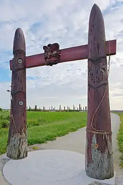 In 2017, the Ātea a Rangi star compass was installed just north of the bridge over the Ngaruroro River. The circle of carved wooden posts (pou) represents the points of the compass and symbolises the navigational skills of ancient Pacific Island explorers who navigated the oceans to arrive here and settle in the area.[49] The celestial compass is also used to pass the art of Whakatere waka (traditional navigation) to new generations.[51]