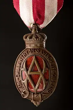 In 1911, Ayaiga saved the life of Mounted Police Constable William Johns during a river crossing.[2] Ayaiga and three other men had been arrested for cattle stealing and was being transported in neck chains by Constable Johns. While attempting to cross the Wilton River, Johns' horse overturned kicking him in the head and knocking him unconscious.[3] Despite the neck chain, Ayaiga quickly rescued Johns, dragging him to safety. Ayaiga then borrowed Johns' horse and rode to Hodgson Downs Station to request help. He was not convicted of cattle stealing.[4] Then on 16 February 1912 he was awarded the Albert Medal for Lifesaving by King George V at Government House,[5] making him the first Indigenous Australian awarded a medal for gallantry.[6][a] He was not permitted to keep the medal, which was kept for him by the government to wear on special occasions.[8]
