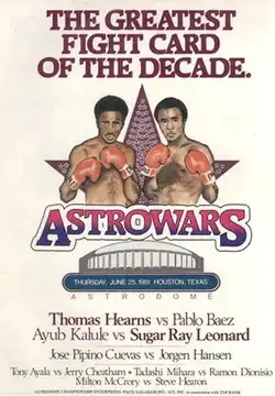 In January 1981, it was announced that reigning WBC welterweight champion "Sugar" Ray Leonard would move up in weight in order to pursue his second world title in his second different weight class by challenging WBA light middleweight champion Ayub Kalule.[2] Eventually, WBA welterweight champion Thomas Hearns was added to the card, dubbed Astrowars as it was held in Houston's Astrodome, defending his title against Pablo Baez in the co-main event.[3]