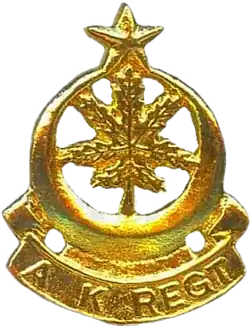 The Azad Kashmir Regiment was established in 1974 from the original Kashmir Liberation Forces that rose in 1947 in rebellion against the Maharaja of Jammu and Kashmir in present-day Azad Kashmir. They were regularised at the end of the First Kashmir War and made a part of the Pakistan Army under the name Azad Kashmir Regular Force (AKRF).[1][2] The force has the distinction of not having been raised by any government order, but "raised itself" when bands of armed World War II veterans along with locals (including women such as Mujahida Hussain Bibi), organized themselves into disciplined ad hoc platoons, companies and battalions led by retired officers, JCOs and NCOs, and went out to fight in Kashmir against the Indian Army in 1948.[3][4] The AKRF had its own intake and training structure separate from the Pakistan Army. Uniforms and rank structures were the same as in the Pakistan Army. At that time, all the battalions of the AKRF were part of the 12th Infantry Division of the Pakistan Army, permanently stationed in Azad Kashmir. Although upon requirement, two AKRF regiments (12th and 21st) were sent to East Pakistan as part of reinforcements to Eastern Command. Originally created as a militia, the AKRF functioned as a paramilitary force.[5]