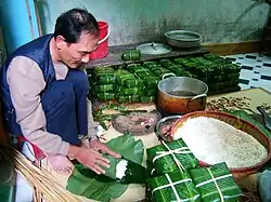 The required ingredients of bánh chưng are glutinous rice, mung bean, fatty pork and black pepper, salt, sometimes green onion, and nước mắm for salty taste.[7] In the wrapping stage, one needs lá dong, strings split from giang (Maclurochloa sp.), one type of bamboo which has long node, and sometimes a square mold in wood so that bánh chưng can be wrapped in a better shape, lá dong, which is popular only in Southern Asia, can be substituted by banana leaves or even lá bàng.[8] Lá dong and giang strings have to be washed carefully in order to preserve the taste of the cake, giang strings may be soaked in water or steamed so that they become flexible enough for wrapping and tying. People often choose high-quality rice and beans for making bánh chưng. The mung beans are soaked in water for approximately 2 hours and the glutinous rice for 12 to 14 hours. The mung beans are drained, cooked and mashed into a paste. The fat in the pork is preferred for bánh chưng because its fatty flavor associates well with the glutinous rice and mung beans. After being sliced in approx. half-inch thick strips, the pork is mixed with pepper, onion, salt and nước mắm. Sugar can also be added to this mixture of spices.[9]