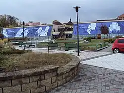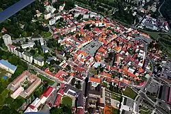The modern urban development of the town was influenced by industrial production and uranium mining in the region. Residential neighbourhoods consisting of large amounts of prefabricated housing were built on the outskirts, while the town centre was preserved and declared as an urban monument zone.[5]