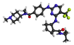 BI 811283 is a small molecule drug that selectively binds to the ATP binding pocket of Aurora B kinase, inhibiting its function in cell division.[1] The Aurora B kinase protein (also known as STK12) is one of a family of proteins that plays an essential role in the alignment, movement and separation of chromosomes during cell division. Aurora B kinase is produced in all dividing cells in normal tissue however; the levels of Aurora B kinase are abnormally raised in many types of cancer.[2][3][4][5][6][7][8][9][10] Abnormally elevated levels of Aurora B kinase, cause unequal chromosomal separation during cell division, resulting in the formation of cells with abnormal numbers of chromosomes, which are both a cause and driver of cancer.