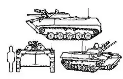 The BMD-1 is a Soviet airborne amphibious tracked infantry fighting vehicle (IFV), which was introduced in 1969 and first seen by the West in 1970. BMD stands for Boyevaya Mashina Desanta (Боевая Машина Десанта, which literally translates to "Airborne Combat Vehicle").[12] It can be dropped by parachute and although it is of similar shape to the BMP-1 it is smaller, at just over half the weight. The BMD-1 was used as an IFV by the Soviet Airborne Forces (VDV). An improved variant of the BMD-1 was developed, the BMD-2. The BMD-1 also provided a basis for the BTR-D airborne multi-purpose tracked APC.