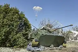 A rocket parachute, the PRSM-915, was developed to ensure the vehicle's safe landing.[4] To use the parachute, the BMD is first packed onto a special pallet before takeoff. To drop the BMD, a drogue chute is released that initially drags the BMD out of the Il-76 transport plane. Once clear of the plane a single large main chute opens. The deployment of the main chute triggers the deployment of four long rods which hang beneath the pallet.[5]