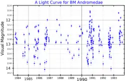 In 1949 Balfour Whitney announced that BM Andromedae (at the time, an unnamed star) is a variable star, based on 400 photographic plates taken from 1942 through 1949. He noted that it varied rapidly and irregularly, sometimes varying by 1 magnitude over the course of a single day.[8]