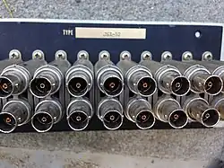 Rear view of a patch panel with BNC jacks in close proximity.[15]