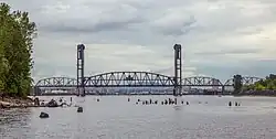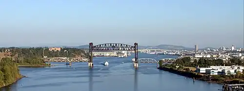 The BNSF Railway Bridge 5.1,[2][4] also known as the St. Johns Railroad Bridge[2][4][5] or the Willamette River Railroad Bridge,[6] is a through truss railway bridge with a vertical lift that spans the Willamette River in Portland, Oregon, United States. Built by the Spokane, Portland and Seattle Railway (SP&S) and completed in 1908, it was originally a swing-span bridge, and its swing-span section was the longest in the world at the time.[6][7] However, 81 years later the main span was converted from a swing-type to a vertical-lift type, in order to widen the navigation channel. The lift span is one of the highest and longest in the world.[2] The bridge consists of five sections, with the two sections closest to the bank on each side fixed.