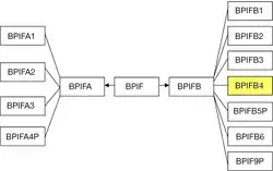 Genes for the BPI/LBP/PLUNC superfamily are found in all vertebrate species, including distant homologs in non-vertebrate species such as insects, mollusks, and roundworms.[14][15] Within that broad grouping is the BPIF gene family whose members encode the BPI fold structural motif and are found clustered on a single chromosome, e.g., Chromosome 20 in humans, Chromosome 2 in mouse, Chromosome 3 in rat, Chromosome 17 in pig, Chromosome 13 in cow. The BPIF gene family is split into two groupings, BPIFA and BPIFB. In humans, BIPFA consists of 3 protein encoding genes BPIFA1, BPIFA2, BPIFA3, and 1 pseudogene BPIFA4P; while BPIFB consists of 5 protein encoding genes BPIFB1, BPIFB2, BPIFB3, BPIFB4, BPIFB6 and 2 pseudogenes BPIFB5P, BPIFB9P. What appears as pseudogenes in humans may appear as fully functional genes in other species.