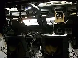 The gunner sits in a roof-mounted chair located above the flat floor behind the driver/commander and two passengers, and before the passenger bench.