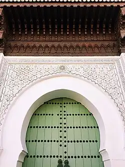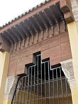 The mosque's form and layout is highly similar to the Mouassine Mosque, which was built shortly after it. It also continues many of the architectural characteristics of the earlier Almohad mosques such as the Kutubiyya Mosque and the Tinmal Mosque.[1] Although slightly smaller than the Mouassine Mosque, the architecture of the Bab Doukkala Mosque is in some ways more sophisticated and more carefully decorated.[1][6] The mosque itself has a standard floor plan for the Saadian period: its southern section consists of a hypostyle prayer hall while its slightly larger northern section consists of a nearly square internal courtyard (a sahn) surrounded on all sides by a roofed gallery of arches. The courtyard measures 29 meters by 30 meters and has a fountain at its center.[1]: 36–38 [6] The minaret is located at the mosque's northeastern corner. Its façades are decorated with darj-wa-ktaf motifs and blind lambrequin arches.[1]: 37