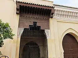 The mida'a structure also features a richly decorated street fountain on its exterior; a Saadian architectural tradition also seen in the Mouassine Fountain and the Shrob ou Shof Fountain (and again with precedents found in the Almoravid-era Ben Youssef complex).[1]: 70 The fountain, adjoined to the mida'a's northeastern façade, consists of three arched bays in a row to the right, which contained water troughs for animals, and a fourth bay on the left which contained a water basin for humans. (A wooden bar across the fountain's opening traditionally prevented large animals from reaching the water intended for humans.) The facility thus provided water for the neighbourhood, an act of charity which had religious connotations as well. Only the fountain for humans features any decoration: the arch of the fountain is decorated with carved stucco consoles below a corbelled wood lintel above which is a wooden canopy. The current stucco consoles probably date from later restorations, but the wooden lintels above it are most likely original. They are made in cedar wood and carved with the same kind of ornamentation found in other fountains of the Saadian era.[1]: 70–72 In addition to floral motifs, the top lintel is carved with an inscription in Thuluth script which reads (approximate translation): "The most beautiful words that have been said are: praise to God in all circumstances!"[1]: 72
