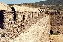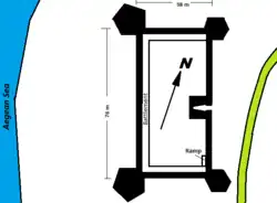 The castle has a rectangular plan with dimensions of approx. 38 m × 76 m (125 ft × 249 ft) having a watchtower on each corner. It is oriented northwest to southeast with the seashore to the southwest. The watchtowers on the landward side have a hexagonal prism form while the watchtowers overlooking the sea are much larger and are in the form of pentagonal prisms. The main gate, which has a marble inscription above it, is situated in the middle of the north-eastern curtain wall. An L-shaped pincer gate in a covered structure behind the pointed arch gate leads to the castle's interior courtyard. The pincer gate features one large barrel vaulted niche at each side and above where guards would have been located. The gate opens to the castle's interior through a wide, tall, semi-circular arched portal. A finial relief is found on the keystone of the inner portal. A small additional hidden opening is situated next to the watchtower on the south-eastern curtain wall.[1] The battlements are reached by a ramp in the southern corner. Access to the four watchtowers is through the battlements. The embrasures between the merlons of the watchtower battlements were constructed at an angle that widens outwards making it suitable for firing cannons.[1]