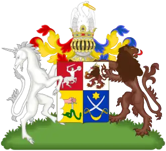 The shield is crowned with a helmet and a royal crow. The crest is a pelican looking to the right. The supporters are a unicorn on the left and a lion on the right.[2]