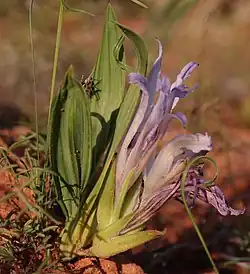 The sweetly, mostly daffodil-like scented flowers sit with four to eight together in an inclined or horizontal spike, each subtended by two entire green, sparely hairy bracts of 20–32 mm (0.79–1.26 in). The inner bract is slightly shorter than the outer and split entirely or almost to the base and has wide transparant margins. The base colour of the mirror-symmetrical perianth is pale lilac or pale blue, merged to a narrowly funnel-shaped tube of 12–18 mm (0.47–0.71 in) long that splits into six unequal perianth lobes, the dorsal 30–45 mm (1.2–1.8 in) long and 7–10 mm (0.28–0.39 in) wide. The other five are 20–30 mm (0.79–1.18 in) long and merged to each other for about 4 mm (0.16 in) forming a distinctive lower lip. The lower lateral lobes are adorned with a cream-coloured or white splash in its basal half accentuated by dark violet to blue and have undulating or crisped margins. Three stamens are crowded at the dorsal side of the flower and consist of a 13–18 mm (0.51–0.71 in) long, arched filament and carrying a anther of 6–8 mm (0.24–0.31 in) long that contains white pollen. Below the perianth tube sits an ovary that is thinly hairy in the upper half, on the ribs or rarely hairless. From the ovary the style emerges, which splits into three branches of 4–5 mm (0.16–0.20 in) long between the middle and the tip of the anthers. These style branches widen considerably towards their tips. This species flowers between June and August.[1]