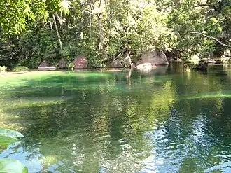 The Devil's Pool is at the top of a perilous section of Babinda Creek. Approximately 700 m (770 yd) downstream from the main swimming hole, the river valley narrows considerably and the creek channel is filled with massive boulders and lined with bedrock, polished smooth by the water flow over millennia. In the dry season, the water in Babinda Creek passes over and under these rocks, sometimes disappearing from view altogether. In the wet season, the boulders are often completely covered.[12][13]