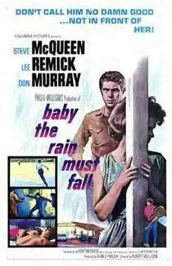Baby the Rain Must Fall is a 1965 American drama film directed by Robert Mulligan and starring Lee Remick, Steve McQueen and Don Murray. Dramatist Horton Foote, who wrote the screenplay, based it on his 1954 play The Traveling Lady.[2] This is Glen Campbell's film debut, in an uncredited role.