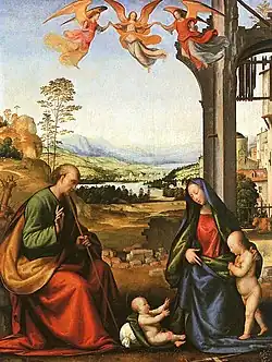 Fra Bartolomeo or Bartolommeo OP (UK: /ˌbɑːrtɒləˈm/, US: /-tl-/, Italian: [bartolo(m)ˈmɛːo]; 28 March 1472 – 31 October 1517), also known as Bartolommeo di Pagholo,[1] Bartolommeo di San Marco,[2] Bartolomeo di Paolo di Jacopo del Fattorino, and his original nickname Baccio della Porta,[2] was an Italian Renaissance painter of religious subjects. He spent all his career in Florence until his mid-forties, when he travelled to work in various cities, as far south as Rome. He trained with Cosimo Rosselli and in the 1490s fell under the influence of Savonarola, which led him to become a Dominican friar in 1500, renouncing painting for several years. Typically his paintings are of static groups of figures in subjects such as the Virgin and Child with Saints.[3]