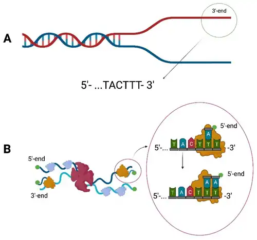 Φ29 is one of many phages with a DNA polymerase that has a different structure and function compared to standard DNA polymerases in other organisms.[22] Φ29 forms a replication complex involving the p3 terminal protein, the dAMP nucleotide, and its own DNA polymerase to synthesize DNA in a 5’ to 3’ direction. This replication process also employs a sliding-back mechanism towards the 3’ end of the genome that uses a repeating TTT motif to move the replication complex backward without altering the template sequence.[22][23] This allows the initiation of DNA replication to be more accurate by having the polymerase complex check a specific sequence before beginning the elongation process.[23][24]
