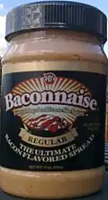 Baconnaise is a bacon-flavored, mayonnaise-based food spread that is ovo vegetarian and kosher certified. It was created by Justin Esch and Dave Lefkow, founders of J&D's Foods, in November 2008, and sold 40,000 jars within six months.[3] It was test-marketed in Grand Forks, North Dakota, to determine consumer interest.[4] After being featured on both The Daily Show and The Oprah Winfrey Show, sales of Baconnaise increased significantly, with more than a million jars sold.