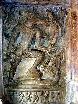 The cave portrays the Tandava-dancing Shiva as Nataraja on the rock face to the right of entrance and also part of Gandharveda.[24][26][19] The image, 5 feet (1.5 m) tall, has 18 arms (9 in left and 9 on right) in a form that expresses the dance position (about 9x9=81 combinations in total) arranged in a geometric pattern, which Alice Boner – a Swiss art historian and Indologist, states is a time division symbolizing the cosmic wheel.[19] The eighteen arms express Natya mudras (symbolic hand gestures),[27] with some holding objects such as drums, a flame torch, a serpent, a trident and an axe.[25] Shiva has his son Ganesha and the bull Nandi by his side. Adjoining the Nataraja, the wall depicts the goddess Durga of Shaktism tradition slaying the buffalo-demon Mahishasura.[25] The sculptors had excellent knowledge of the natya mudras of Bharatanatya (a very popular classical dance in southern part of India), because there is no chance to correct any errors and it has to be perfectly carved at the first place otherwise the entire cave has to be abandoned.