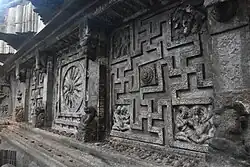 Inside the temple are friezes showing stories from Hindu texts such as the Bhagavata Purana.[19][33] These show the legend of cosmic ocean churning (Samudra Manthan) and Krishna's birth and flute playing indicating the theological and cultural significance of these in 7th century India. The ceiling and door head carvings show Gajalakshmi, the swastika symbols, flying couples, Brahma, Vishnu asleep on Shesha and others.[11][30][34]