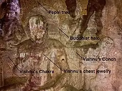 There are several theories as to who the statue represents. One theory holds that it is a relief of the Buddha in a sitting posture.[58] This is supported by two chauri bearers who may be Bodhisattvas flanking the Buddha. According to George Michell, the halo, the Pipal tree, and cloak-like dress suggests that this was originally a Buddha statue.[56] According to B.V. Shetti – archaeologist and curator of Prince of Wales Museum of Western India,[59] the cave was not converted but from the start represented a tribute to Mayamoha of the Hindu Puranas, or Buddhavatara Vishnu (ninth avatar of Vishnu). This theory is supported by the chakra, conch and jewelry included in its iconography. The style suggests it was likely carved in or before the 8th century.[57]