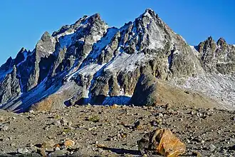 During the Pleistocene period dating back over two million years ago, glaciation advancing and retreating repeatedly scoured the landscape leaving deposits of rock debris.[6] The U-shaped cross section of the river valleys is a result of recent glaciation. Uplift and faulting in combination with glaciation have been the dominant processes which have created the tall peaks and deep valleys of the North Cascades area.