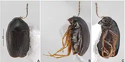 Adults reach a length of about 1.09–1.31 mm and have a dark brown body.