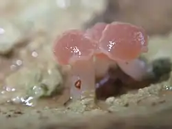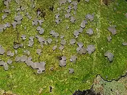 The apothecia (fruiting bodies) of this lichen are small, ranging from 0.1 to 3 mm in diameter. They can be round, slightly raised (subsessile), or more frequently, distinctly stalked, appearing either singly or in clustered formations that resemble branches or racemes. The stalks of these apothecia can grow up to 7 mm tall and may be smooth or have longitudinal grooves, with some parts near the base appearing gnarled due to thalline tissue (lichen tissue). The colour of the apothecial disc varies from pale greyish pink to reddish brown, with its shape changing from persistently concave to flat, or even wavy to convex as it ages. The surrounding rim (proper exciple) is paler than the disc and may become less visible in older apothecia.[6]